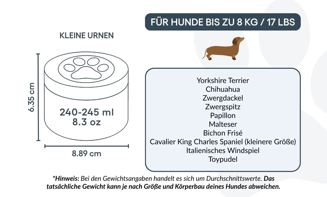 Größe / Fassungsvermögen der Urne: 8,89 cm (B) x 6,35 cm (H) x 8,89 cm (L): 240–245 ml / 8.3 oz Für Hunde bis 8 kg / 17 lbs Typische Rassen: Yorkshire Terrier, Pekinese, Zwergdackel, Toy-Pudel