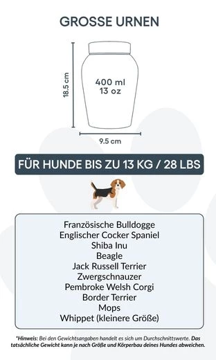 Größen / Fassungsvermögen der Urne: Klein: 7,74 cm (B) x 14 cm (H) x 7,74 cm (L) | 300 ml / 10 oz – geeignet für Hunde bis 10 kg / 21 lbs Typische Rassen: Pomeranian, Shih Tzu, Bichon Frisé, Zwergdackel