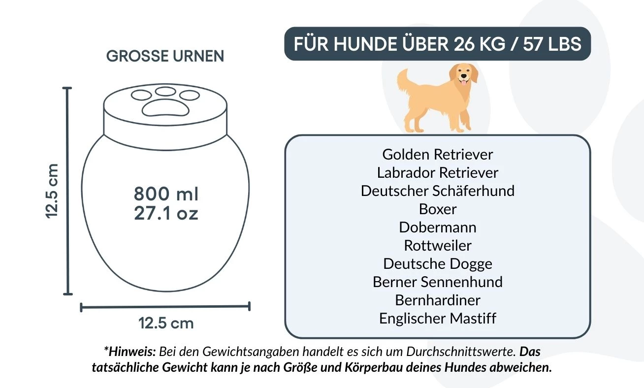 Sie können Ihre Urne individuell personalisieren – mit dem Namen Ihres Hundes, wichtigen Daten und einem optionalen Symbol. So entsteht ein Unikat, das die besondere Verbindung zu Ihrem Haustier widerspiegelt. Die glatte, hochwertige Oberfläche und der sichere Deckel vereinen Ästhetik und Funktionalität – ideal für die Aufbewahrung im Innenbereich.