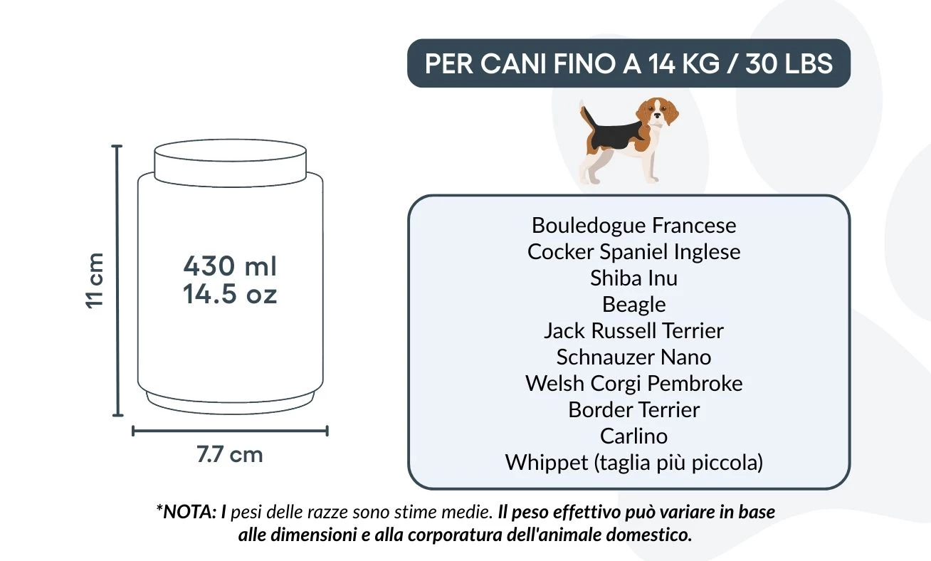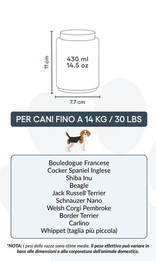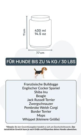 7,7 cm (B) x 11 cm (H) x 7,7 cm (L) | 430 ml / 14.5 oz | für Hunde bis 14 kg / 30 lbs