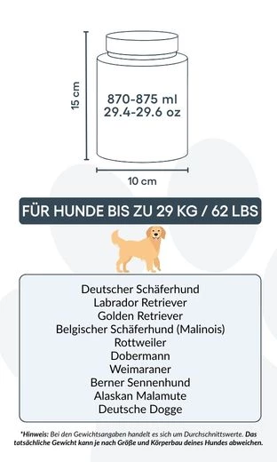 10 cm (B) x 15 cm (H) x 10 cm (L) | 870–875 ml / 29,4–29,6 oz – geeignet für Hunde bis ca. 29 kg / 62 lbs