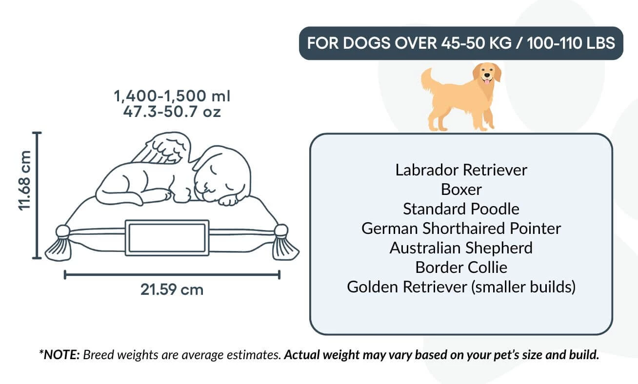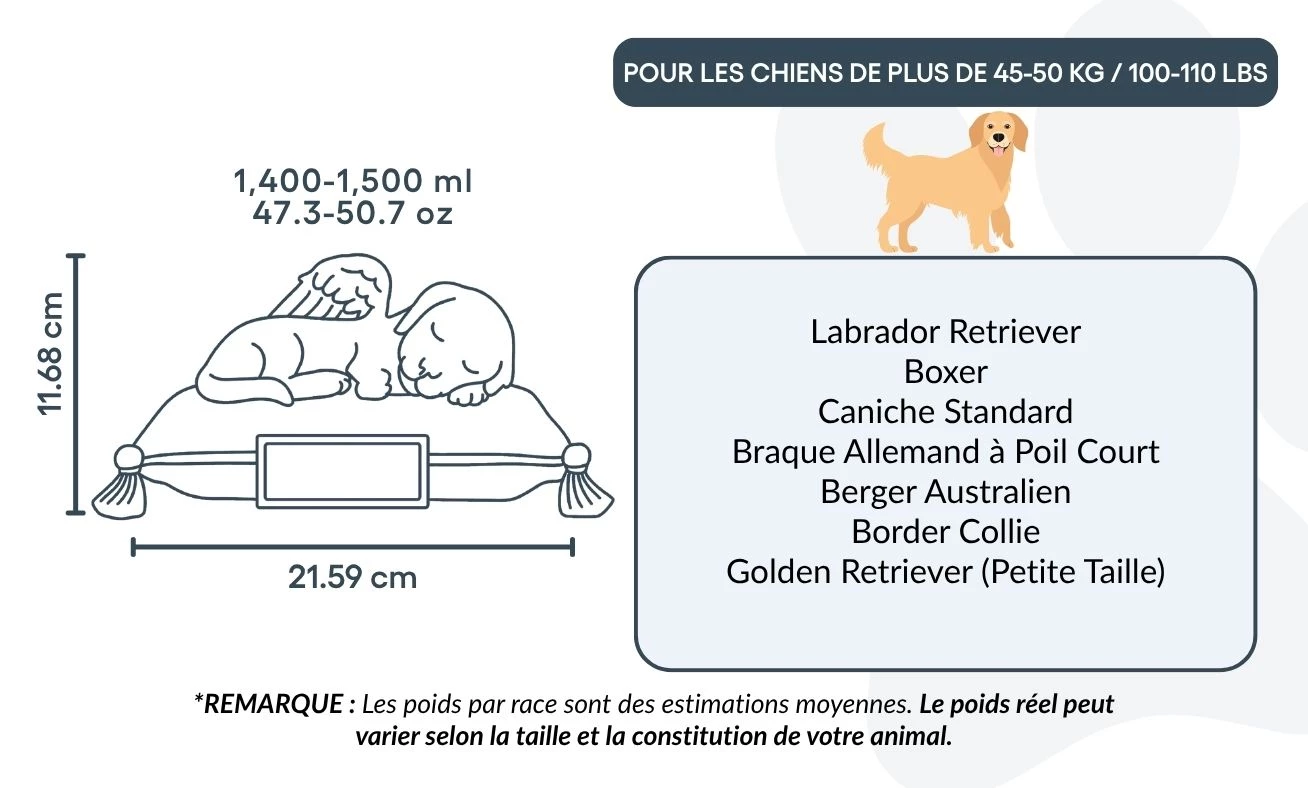 Remarque : la capacité est basée sur des estimations moyennes de crémation. Pensez à prendre en compte le poids et la morphologie de votre animal avant de choisir votre urne.