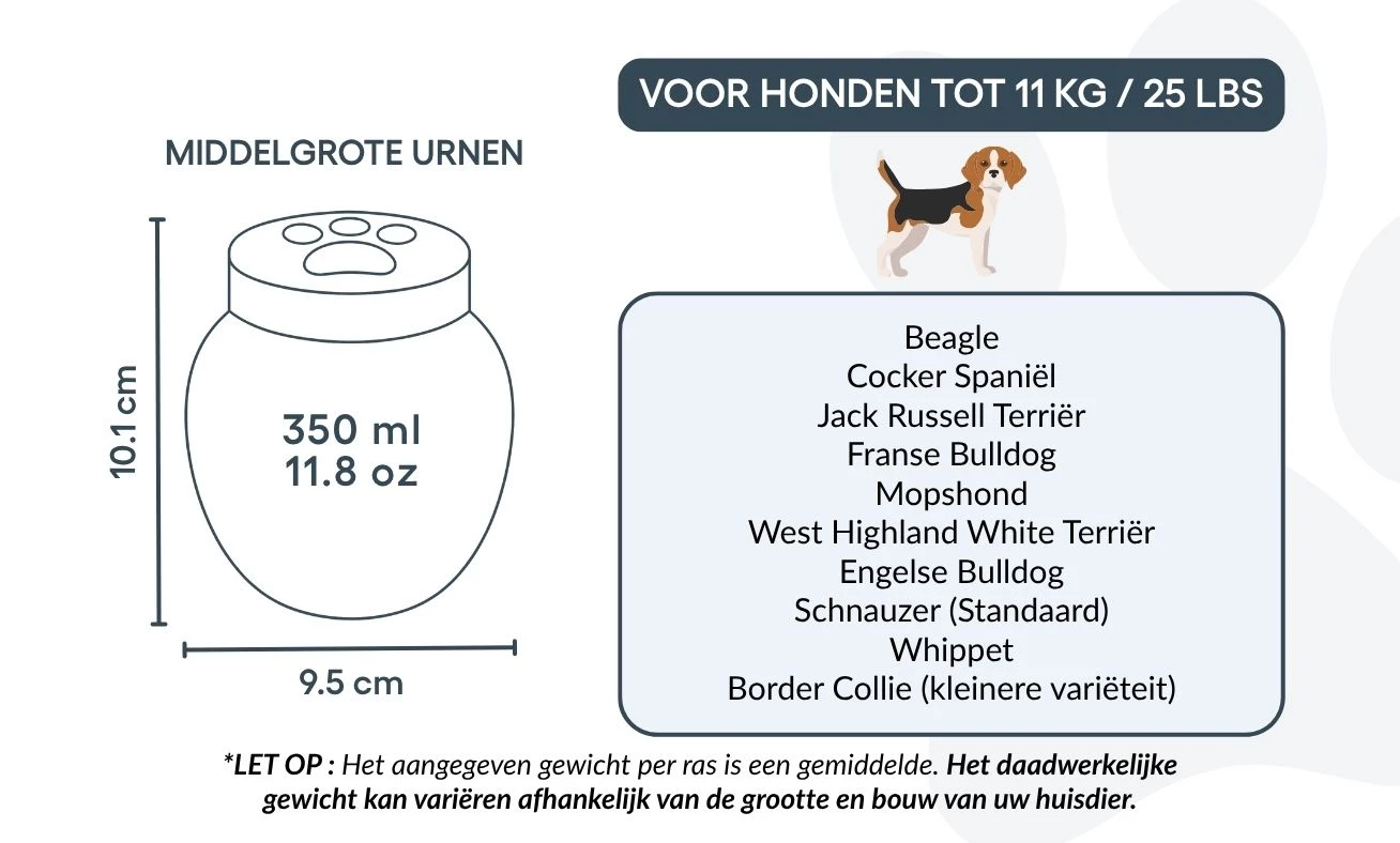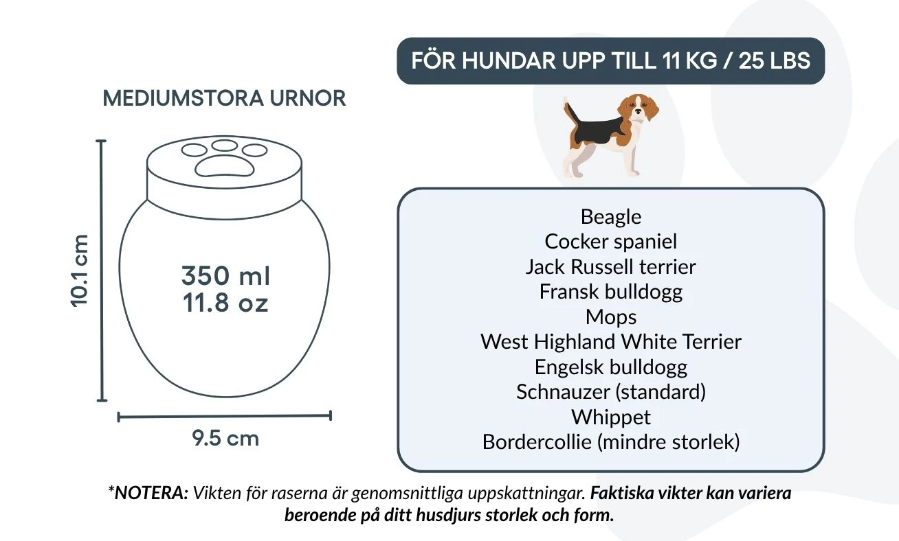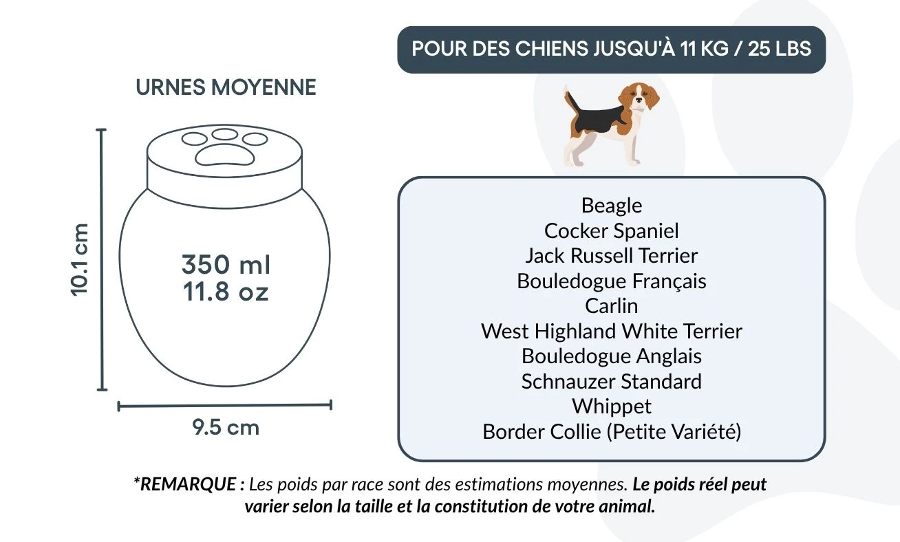 Grâce à ses options de personnalisation complète, vous pouvez créer une urne unique, portant l’histoire de votre chien – car chaque souvenir mérite une place spéciale.