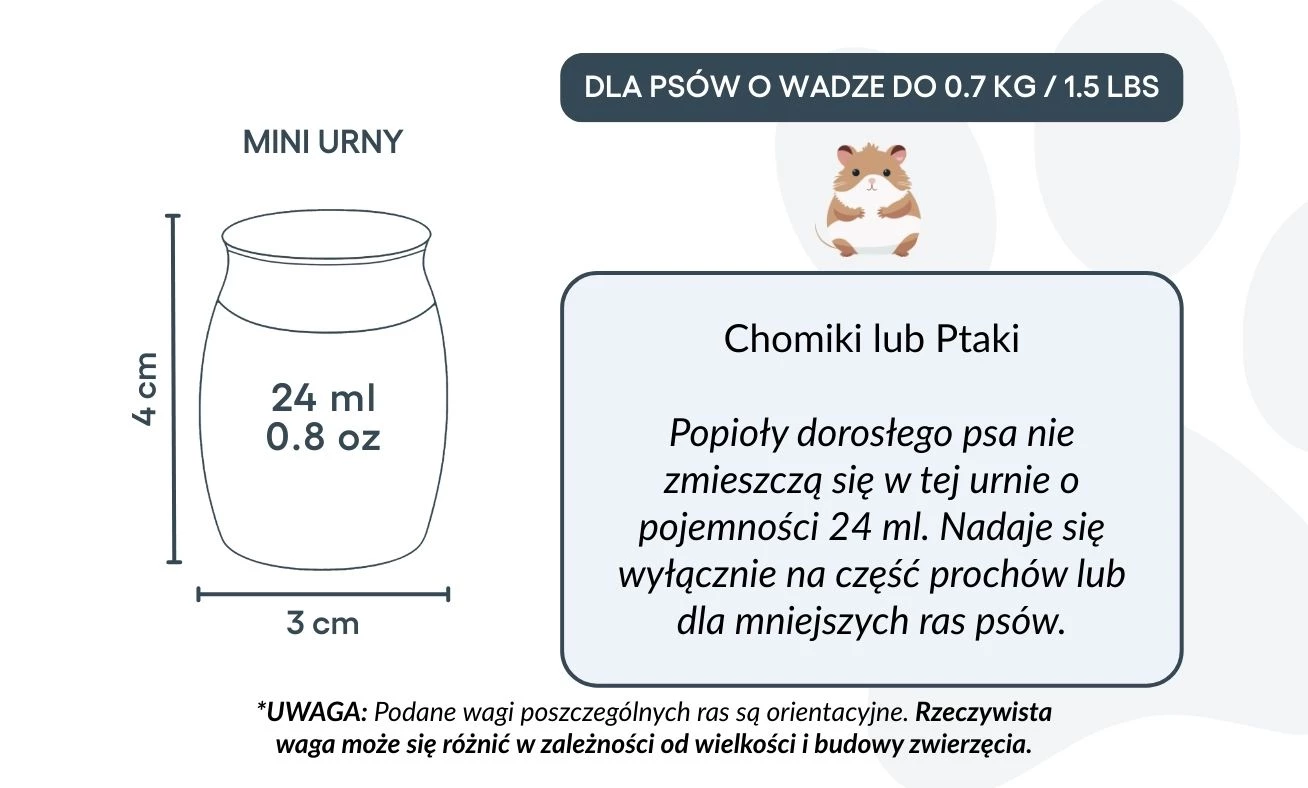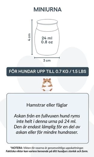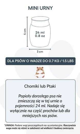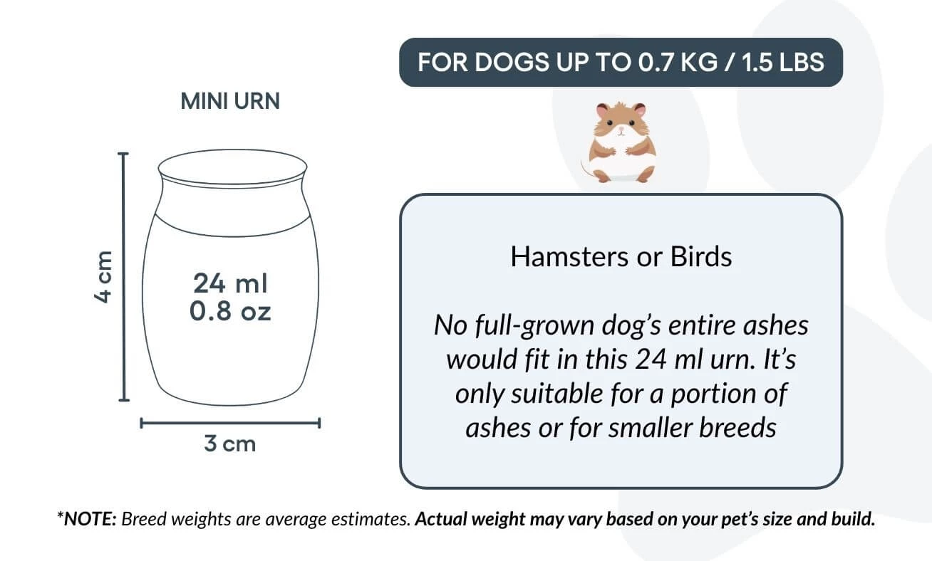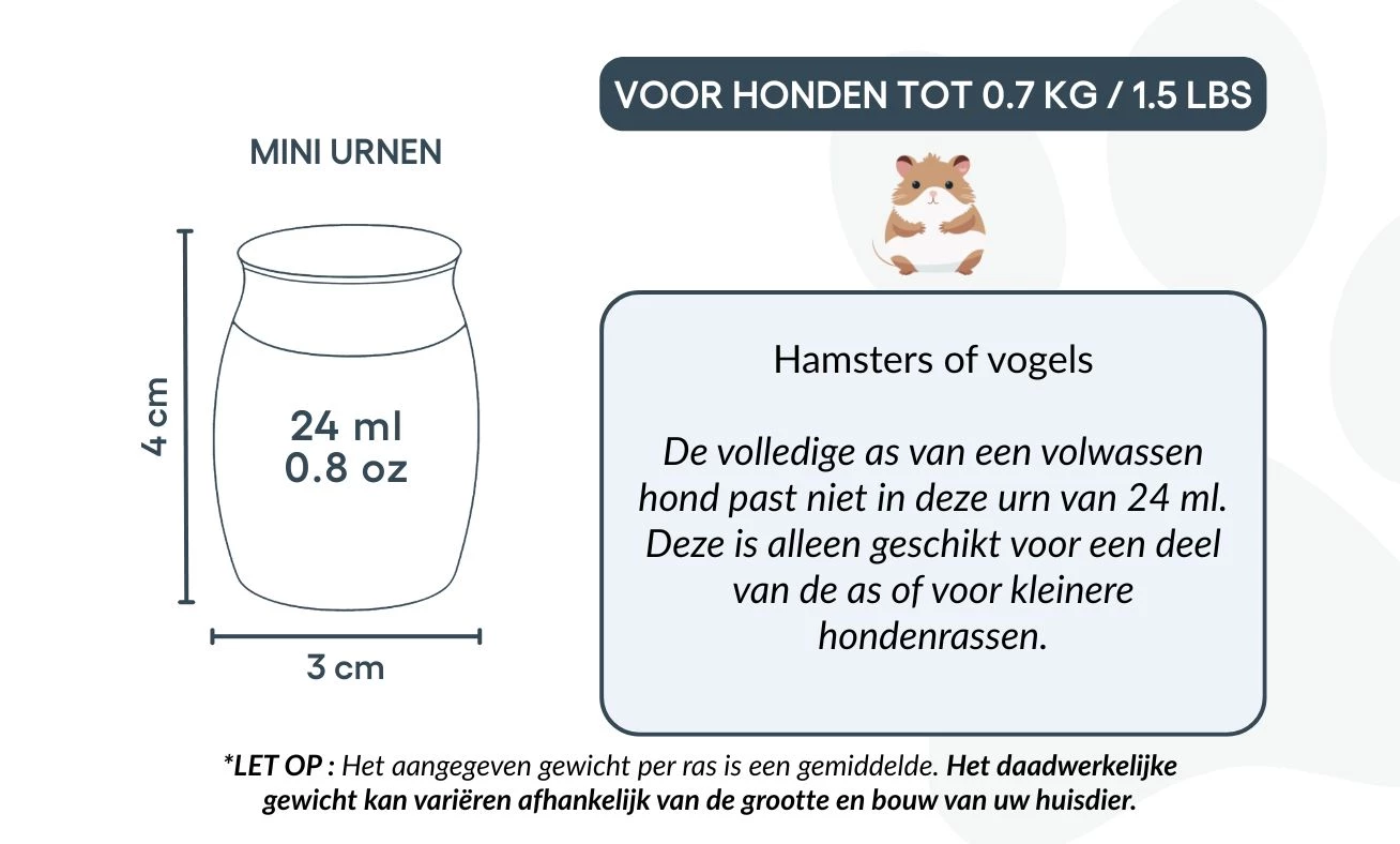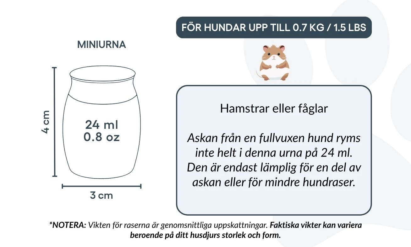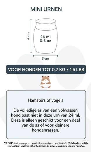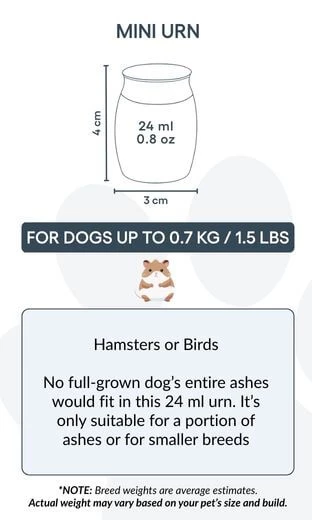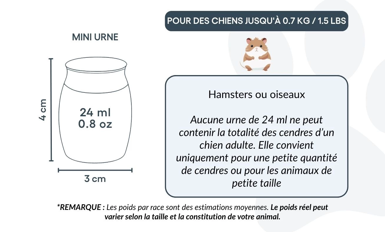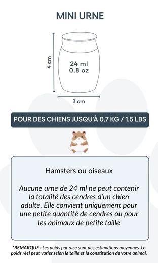 Taille / Capacité de l’urne : 3 cm (L) × 4 cm (H) × 3 cm (P) | 24 ml Profondeur : 25 mm | Diamètre du couvercle : 25 mm | Diamètre de la base : 22 mm Convient pour : hamsters, petits oiseaux, ou une partie des cendres d’un chien de plus grande taille