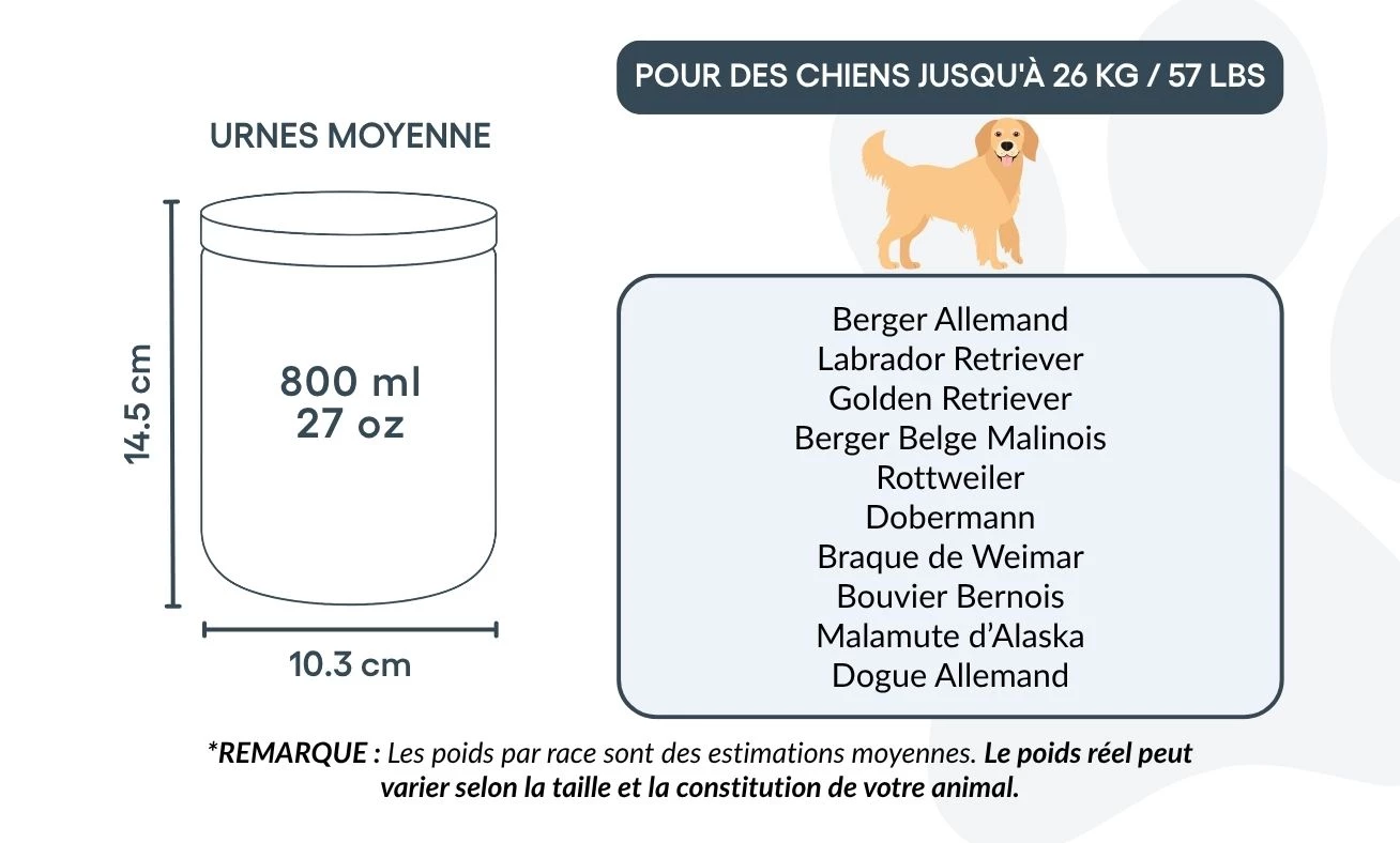 🤍 Disponible en deux tailles : Petite (8,8 oz) et Moyenne (27 oz) – pour les chiens jusqu’à 26 kg / 57 lbs