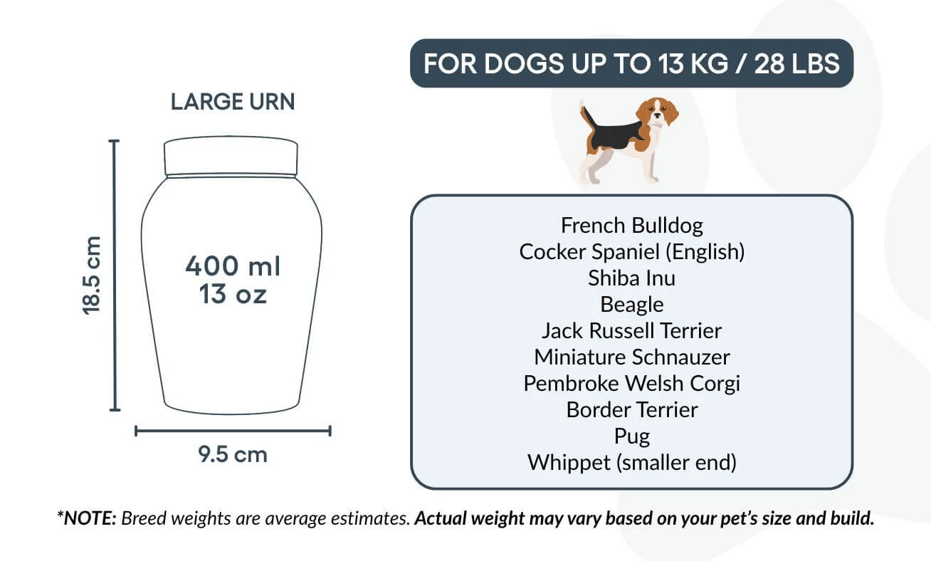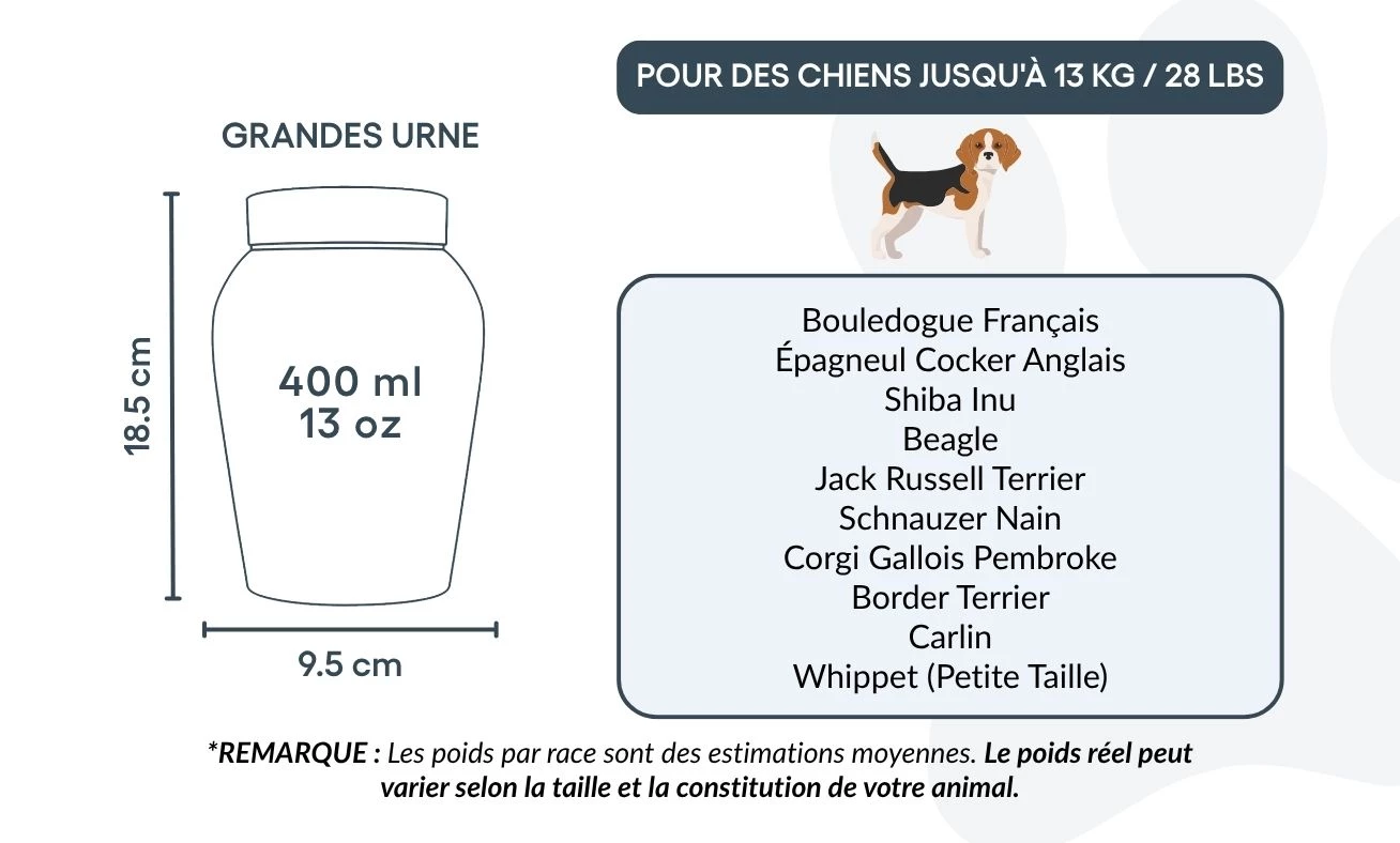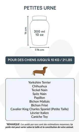 Idéale pour la crémation et la commémoration, cette urne avec photo est à la fois un hommage personnel et un souvenir précieux de la présence fidèle de votre chien.