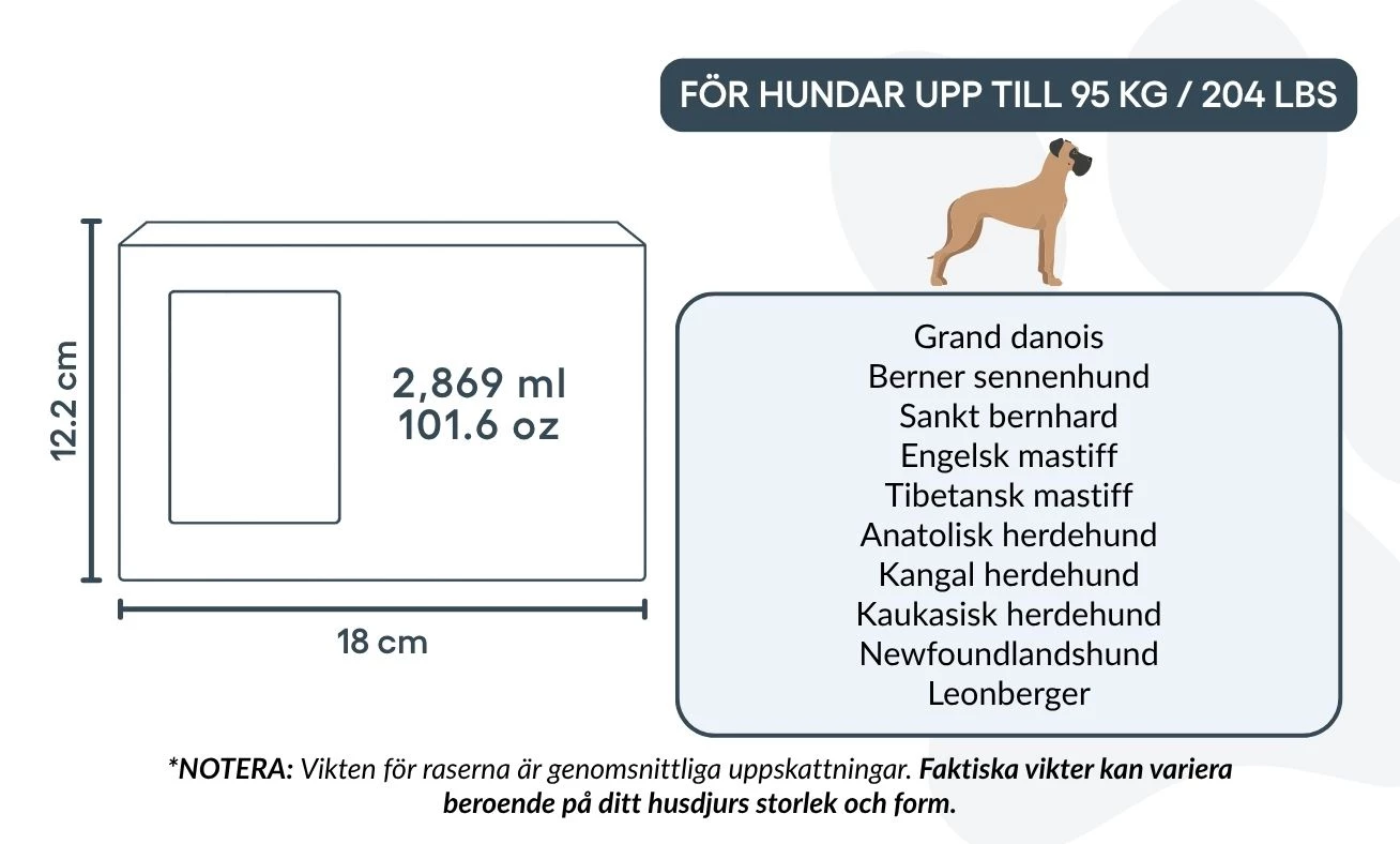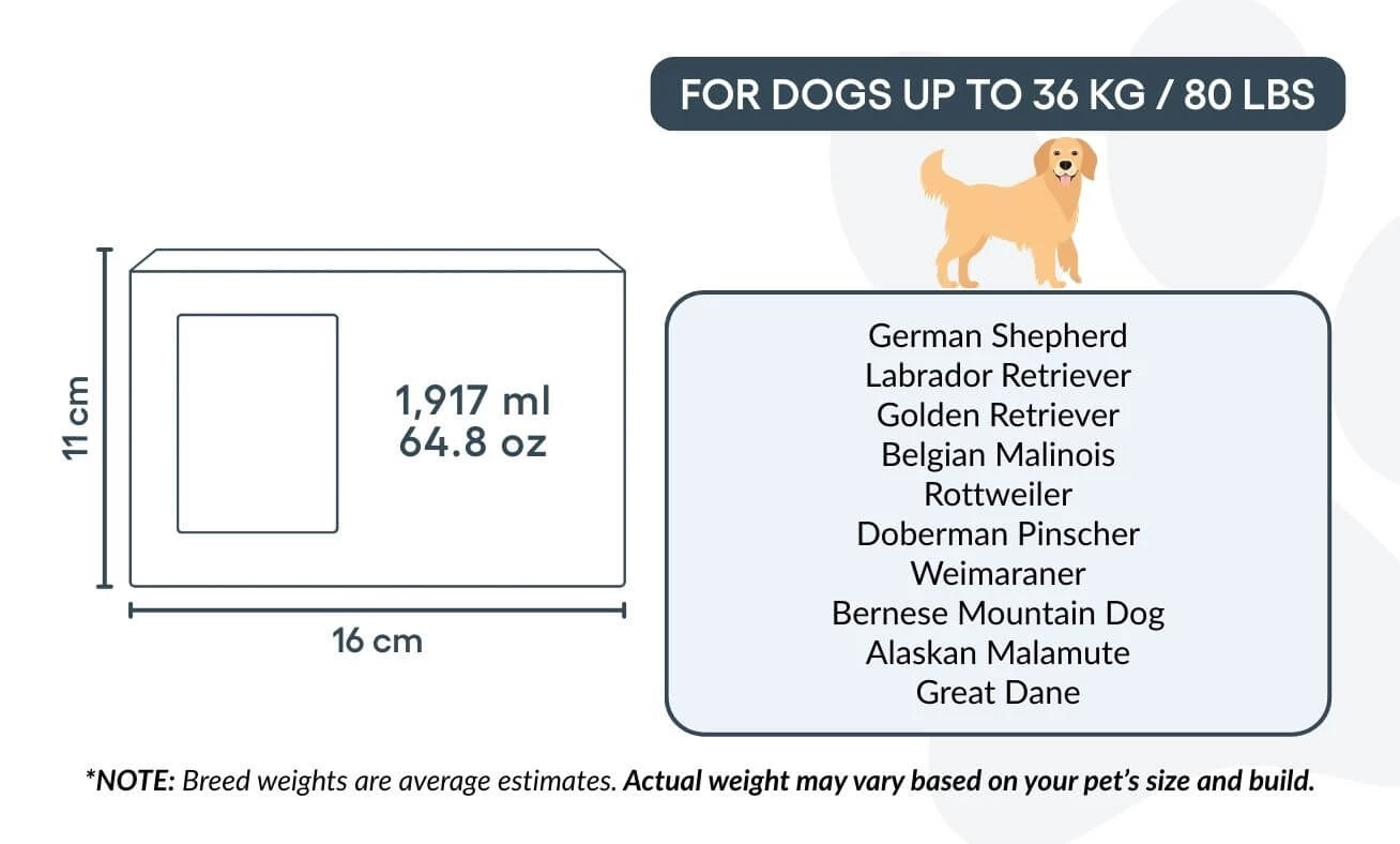 Avec sa grande capacité (~2 869 ml), cette urne funéraire convient aux chiens de taille moyenne à grande, tels que le Labrador, le Berger Allemand ou le Golden Retriever.