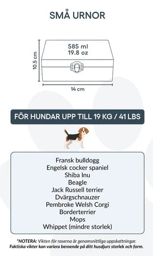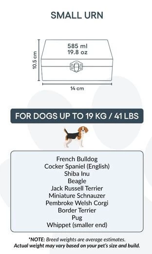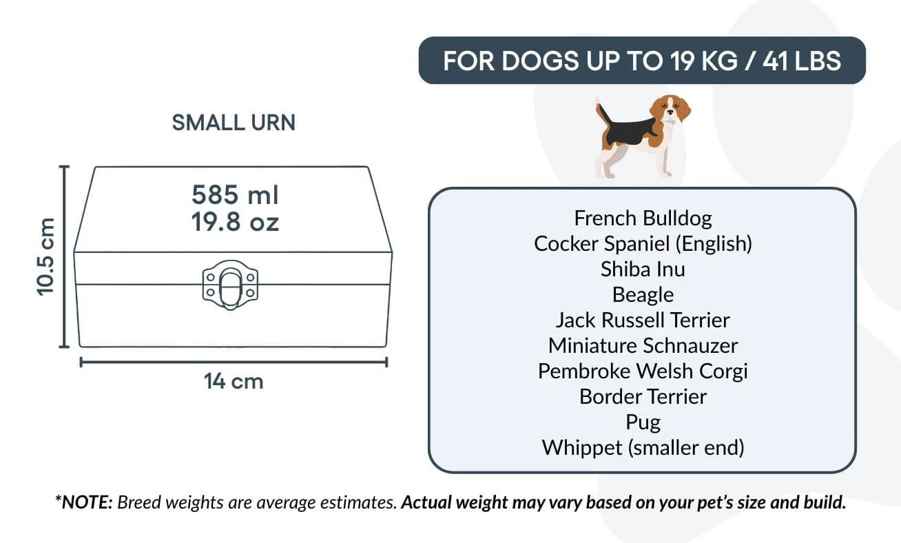 Convient pour les chiens jusqu’à 19 kg / 41 lb, ou pour une partie des cendres d’un chien plus grand.